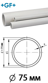 Труба полипропиленовая (гомополимер) pp-h pn 10 sdr 11, pn 6 sdr 17,6 и pn 2,5 sdr 41 Georg Fischer с наружным диаметром d=75 мм производится в Германии на заводе gf deka, который, в свою очередь, входит в корпорацию Georg Fischer Piping Systems (Швейцария) Ltd. Трубы изготавливаются длиной 5 метров с гладкими концами.